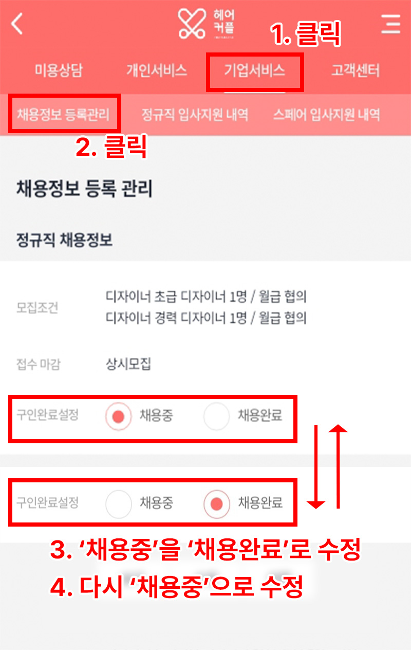 기업회원로그인 > 기업서비스 > 채용정보등록관리 > 채용중 상태를 채용완료로 변경 > 다시 채용중으로 변경 끝!! 최상단 으로 올라 갑니다.